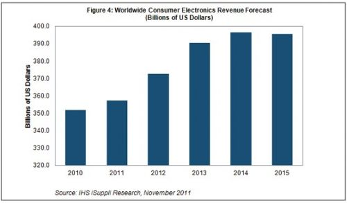但不都是負(fù)面消息。雖然第二和第三季度的消費(fèi)電子營業(yè)收入低于去年同期水平,但隨著電視與藍(lán)光播放器假日銷售高于2010年水平,上述趨勢將從第四季度開始逆轉(zhuǎn)。IHS公司認(rèn)為,預(yù)計(jì)2012和2013年增長率將超過4%,相比于當(dāng)前的低迷狀態(tài),屆時(shí)多數(shù)消費(fèi)電子領(lǐng)域?qū)謴?fù)活力。