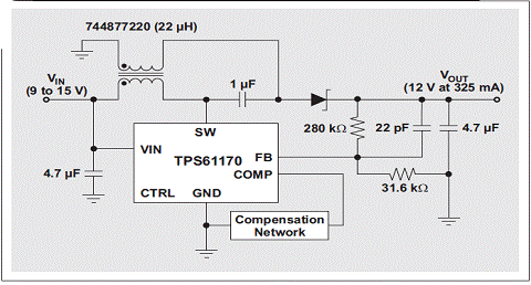 盡管DC/DC單端初級(jí)電感轉(zhuǎn)換器 (SEPIC) 拓?fù)洳皇鞘裁葱聳|西,但的確直到最近它才開始流行起來,然而,對(duì)于能夠?qū)Ω叩洼斎腚妷褐g的輸出電壓(例如:12V未校準(zhǔn)插墻式電源)進(jìn)行調(diào)節(jié)的轉(zhuǎn)換器需求一直都存在。雖然我們可以將任何升壓轉(zhuǎn)換器/控制器配置為一個(gè) SEPIC,但其在最近才得到普遍的使用。兩個(gè)因素促進(jìn)了 SEPIC 的人氣大增:(1) IC 制造廠商已經(jīng)開始制造更多具有電流模式控制功能的升壓控制器,旨在簡(jiǎn)化補(bǔ)償;(2) 電感制造廠商已經(jīng)開始制造許多可以最小化轉(zhuǎn)換器總 PCB 體積的單封裝耦合電感。改用耦合電感以后,許多具有兩個(gè)單獨(dú)電感應(yīng)用的電源體積可以縮減三分之一。圖 1 顯示了使用 TI TPS61170 和 Wuerth 744877220 的一個(gè) SEPIC。