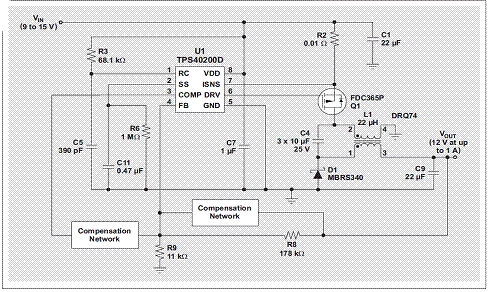 圖 2 使用 TI TPS40200 和 Coiltronics DRQ74 的 ZETA 轉(zhuǎn)換器
