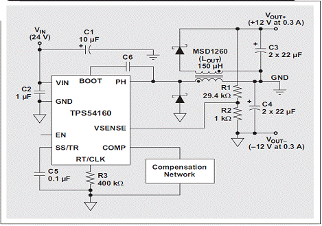 匹配正負(fù)電源軌是許多工業(yè)應(yīng)用的常見要求,對(duì)放大器而言更是如此。我們可以對(duì)寬輸入范圍降壓轉(zhuǎn)換器進(jìn)行配置,以提供負(fù)輸出電壓。使用一個(gè)耦合電感代替這種反相降壓轉(zhuǎn)換器的電感,并增加一個(gè)二極管和電容器,便可將這種反相降壓轉(zhuǎn)換器變?yōu)橐粋€(gè)雙輸出的轉(zhuǎn)換器。圖 3 顯示了以這種方法使用的 TI TPS54160 和 Coilcraft 150-μH MSD1260。只要每個(gè)軌的負(fù)載稍有接近,我們就對(duì)每個(gè)軌之間的差異進(jìn)行調(diào)節(jié)而非單獨(dú)調(diào)節(jié)每個(gè)軌,但耦合電感卻可以幫助提供對(duì)每個(gè)軌進(jìn)行調(diào)節(jié)。