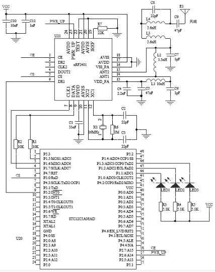 nRF2401 是一個(gè)單片無(wú)線收發(fā)一體芯片,工作在2.4GHz ISM 頻段,完全集成功率合成器、功率放大器、晶體振蕩器和調(diào)整電路。采用QFN24 5×5 毫米封裝,應(yīng)用電路使用外圍元件少(見圖2);采用FSK 調(diào)制方式,125 個(gè)頻道,能滿足多頻及跳頻需要;傳輸速率高達(dá)1Mbps,具有高數(shù)據(jù)吞吐量;功耗低,電源電壓1.9V~3.6V 滿足低功耗設(shè)計(jì)需要;芯片內(nèi)部設(shè)有專門穩(wěn)壓電路,使用各種電源包括DC/DC 開關(guān)電源均有較好的通信效果。