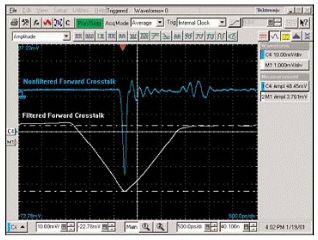 藍色波形是由白色波形濾波后減緩了脈沖上升沿得到的波形,它代表的就是對串擾進行后濾波的結(jié)果。圖中顯示的紅色和藍色兩個串擾波形是以相同的電壓刻度顯示的。