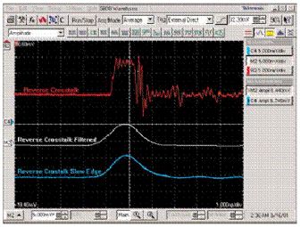 由于測量時來自80E04的輸入階躍電壓具有非常快的邊沿,因而得到的串擾過大,并不能代表實際邏輯電路中的驅(qū)動信號。例如,如果驅(qū)動信號來自一個1.5 ns的CMOS門,產(chǎn)生的串擾脈沖就更寬,幅度也更小。要使測量能夠體現(xiàn)出這種情況,可利用儀器的定義算法(Define Math)功能在信號捕獲之后增加一個低通濾波器。圖7中的M1波形(白色)給出的就是經(jīng)濾波后的測量結(jié)果。需要注意的是M1在垂直方向比未經(jīng)濾波的波形敏感10倍。