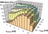 該結(jié)果的解釋需要進一步研究?,F(xiàn)在我們可以說明,在電路板合理的電感值范圍內(nèi),漏極和源極電感必須減小,以確保高的轉(zhuǎn)換器效率。該仿真得出如下結(jié)果:
