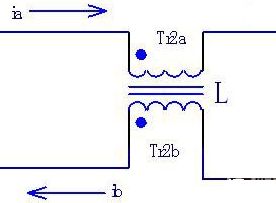 圖1所示的是共模電感的濾波電路,Tr2a和Tr2b就是共模電感L的兩個(gè)線圈。這兩個(gè)線圈繞在同一磁芯上,匝數(shù)和相位都相同。這樣,當(dāng)電路中流過電流ia和ib的大小相同、方向相反時(shí),電流在同相位繞制的電感線圈中產(chǎn)生反向的磁場而相互抵消,磁芯中沒有交變的磁通量產(chǎn)生。