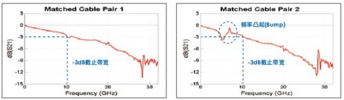 圖1,匹配電纜對的頻率響應,額定帶寬為18GHz。-3dB截止帶寬實際上大約為10GHz,低于額定帶寬。除此之外,兩條電纜的特性不相似,可能在部分信號內(nèi)容過度衰減或放大時導致波形失真。特別是在第二條匹配電纜對上,可以在5GHz~8GHz之間看到頻率響應凸起