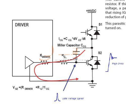 那么在來看看為何400V加上去,就會在下管上的G級上產(chǎn)生尖峰。借花獻佛,抓個圖片來說明: