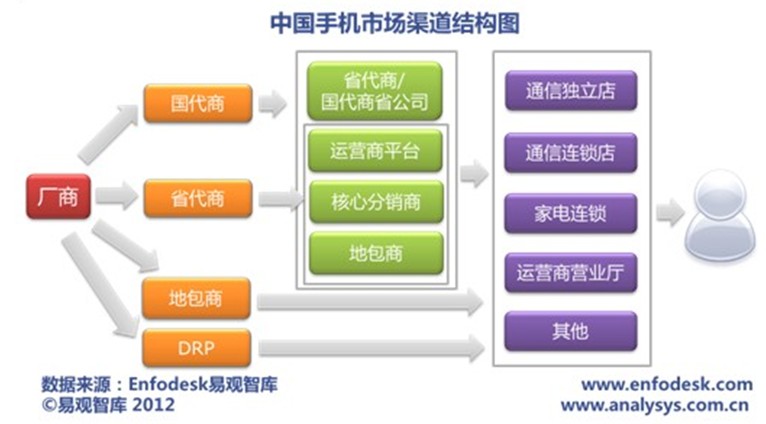 根據(jù)易觀智庫分析,目前我國手機(jī)市場渠道開始進(jìn)入轉(zhuǎn)型期。首先一個比較明顯的變化是手機(jī)廠商直供模式的加強(qiáng),渠道的扁平化趨勢進(jìn)一步加劇。比較明顯的一個例子是三星手機(jī)的渠道改革,從2010年12月起,三星手機(jī)全面推行了直供模式,經(jīng)過一年多的發(fā)展,三星對手機(jī)渠道的把控能力不斷得到了提升。