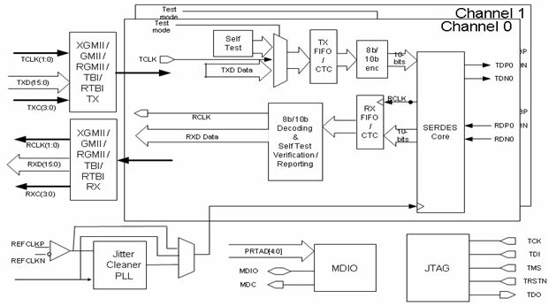 下面詳細(xì)介紹了6個功能模塊及其應(yīng)用特點(diǎn):并行接口、串行接口、時鐘分布電路、8B/10B編解碼電路、PRBS測試以及相關(guān)寄存器訪問控制接口MDIO。