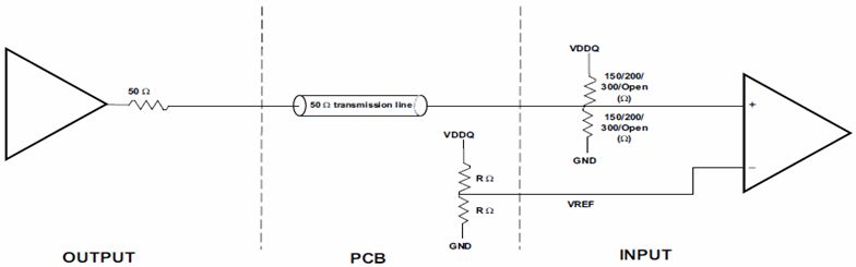 并行接口采用單端的HSTL Class1電平接口,遵循EIA/JESD8-6標(biāo)準(zhǔn)電氣指標(biāo)規(guī)格,同時支持1.5V或1.8V的電源電壓。為了提高HSTL高速接口的SI性能,TLK3132并行接收側(cè)集成了可寄存器配置的匹配電阻,采用戴維南等效電路匹配方式,等效于加一個匹配電阻到VDDQ/2,同時也可關(guān)閉內(nèi)部的阻抗匹配電路,如圖2所示;并行發(fā)送側(cè)可通過寄存器配置4種不同的邊沿速率。