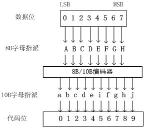在串行鏈路通信中,為了實(shí)現(xiàn)信號時鐘的恢復(fù),需要避免出現(xiàn)長串0和長串1,同時保持電路上正負(fù)電平平衡,能正確地交流耦合避免信號失真,需要傳輸信號中的0和1數(shù)量數(shù)目相等,因此業(yè)界廣泛應(yīng)用8B/10B編解碼方法:實(shí)現(xiàn)8B到10B的映射(圖4),即一個字節(jié)(8bits)用10bits來表示,從中挑選出連續(xù)0或者1個數(shù)不會超過3個,0和1的個數(shù)差不大于2 (最多6個’0’或’1’)。
