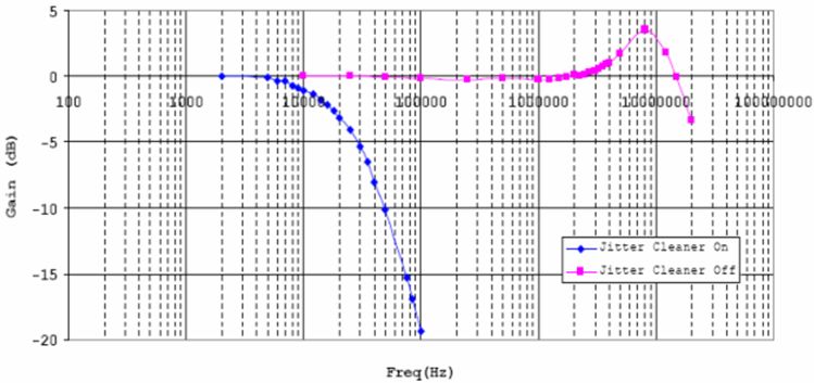 2)由于串并模塊里的高頻倍頻器環(huán)路帶寬很大,最大可達(dá)30MHz左右。故TLK3132內(nèi)部集成了一顆基于LC振蕩器的抖動濾除鎖相環(huán),環(huán)路帶寬通常設(shè)置在幾百KHz以內(nèi),可以對輸入?yún)⒖紩r鐘進(jìn)行濾除,降低參考時鐘對幾百KHz 以上抖動性能的要求,圖6是TLK3132發(fā)送鏈路在抖動濾除器打開和關(guān)閉下的環(huán)路傳遞函數(shù)。此外,抖動濾除器也可對鏈路恢復(fù)的時鐘(只可接收CH0通道的恢復(fù)時鐘RXBCLK(0))進(jìn)行抖動濾除,提高恢復(fù)時鐘的信號質(zhì)量。