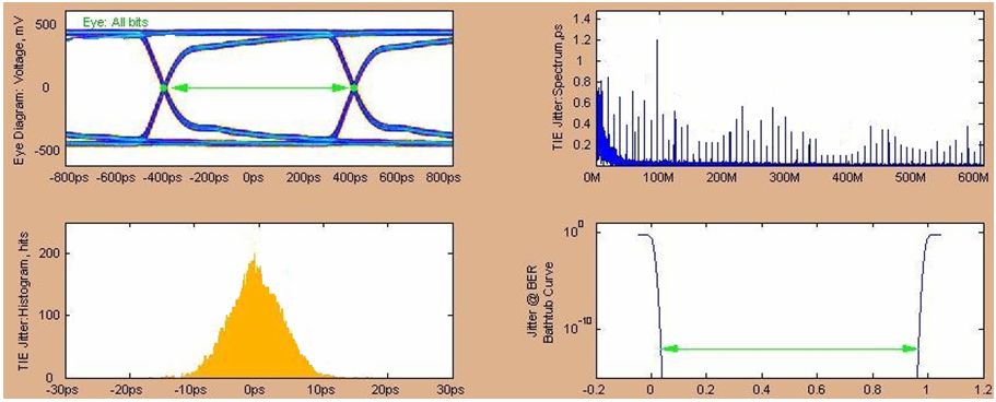 圖10 1228.8Mbps發(fā)送側(cè)眼圖(經(jīng)5inches FR4走線,調(diào)整了最優(yōu)的去加重補(bǔ)償)