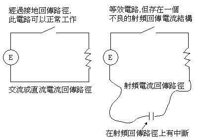 Maxwell方程式、Kirchhoff和Ampere定律全部都在說:若要使一個電路正常工作或依期望的目的工作,一個封閉回路型網絡必須要存在。附圖五表示了這樣的典型電路。當一條走線從來源端到達負載,一個回傳電流路徑也必須要存在,這是Kirchhoff和Ampere定律所規(guī)定的。
