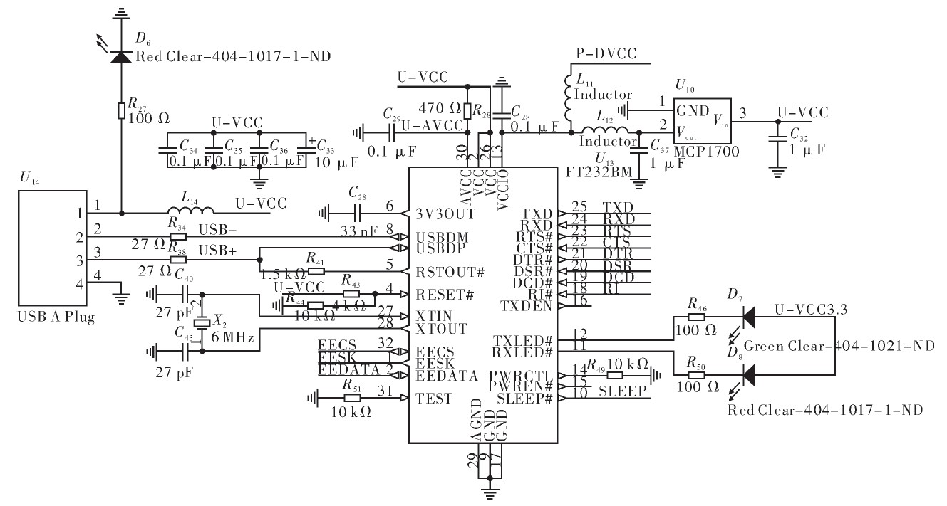 無線傳感器網(wǎng)絡(luò)由大量節(jié)點(diǎn)組成,這些節(jié)點(diǎn)按一定協(xié)議將采集的數(shù)據(jù)進(jìn)行融合、傳輸,最終將數(shù)據(jù)傳送到個(gè)人電腦上進(jìn)行處理和觀察,同時(shí)節(jié)點(diǎn)工作需要將特定的程序?qū)懭隖lash中。目前個(gè)人電腦最常用的接口為USB,而微處理器使用USART接口,為實(shí)現(xiàn)兩種接口之間轉(zhuǎn)換,節(jié)點(diǎn)使用FT232BM芯片作為轉(zhuǎn)換芯片。FT232BM是一種單片USB到異步串口轉(zhuǎn)換芯片,支持全握手和調(diào)制解調(diào)接口信號,在TTL級數(shù)據(jù)傳輸速度范圍為300 bit·s-1~3 Mbit·s-1.芯片通過USB總線供電,工作電壓為4.35~5.25 V,采用外部6 MHz時(shí)鐘。USB PID、序列號和產(chǎn)品信息可以保存在外部EEPROM中。USB通信模塊接口如圖5所示。