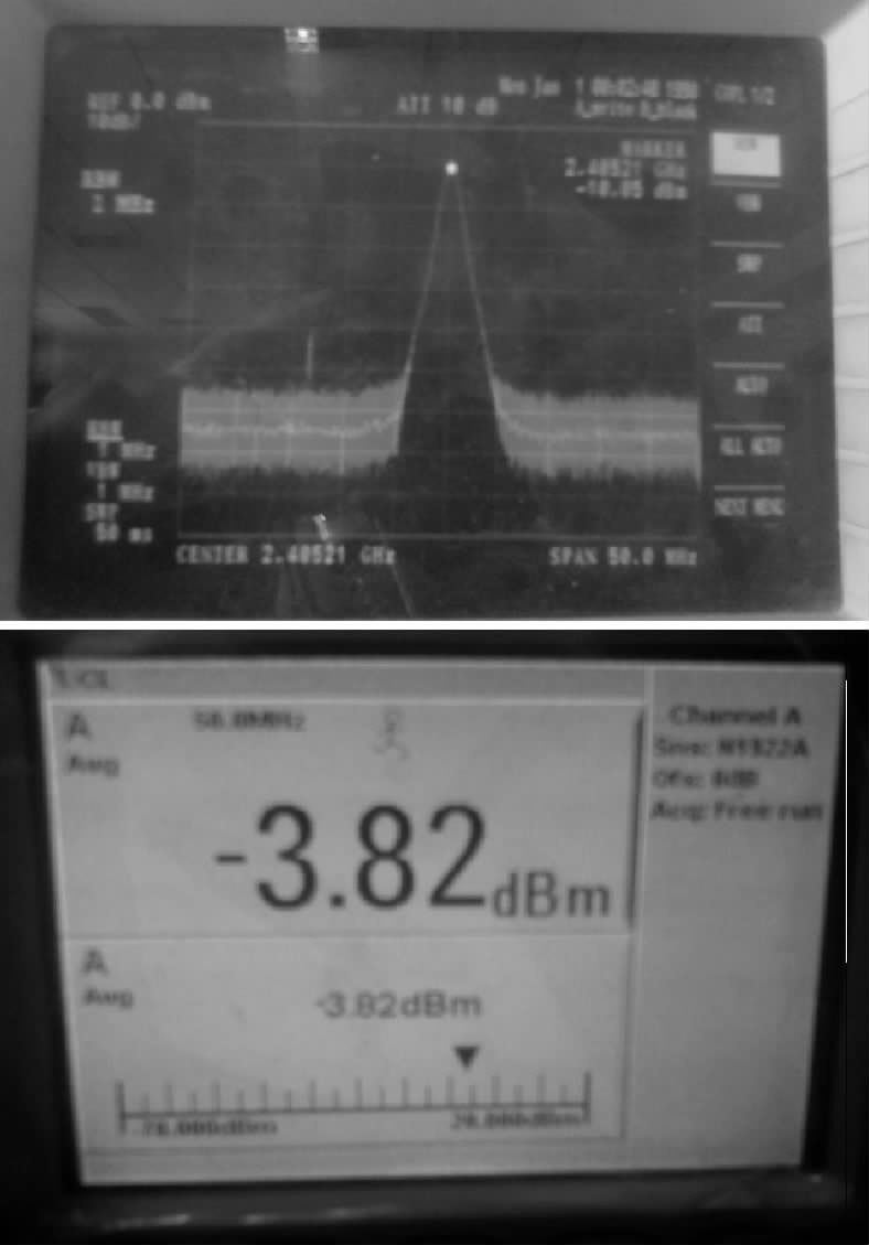 為對設(shè)計(jì)的節(jié)點(diǎn)功能進(jìn)行驗(yàn)證,首先使用IAR集成開發(fā)環(huán)境編寫CC2420的測試程序,通過JTAG將程序燒入Flash,經(jīng)過檢測,射頻部分較好地滿足了預(yù)期。芯片工作頻帶范圍為2.4~2.48 GHz,發(fā)射功率為0 dBm.經(jīng)過頻譜儀和頻率計(jì)驗(yàn)證設(shè)計(jì)符合要求,驗(yàn)證結(jié)果如圖9所示。