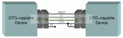在標(biāo)準(zhǔn) USB 中,主機(jī)上的插孔被稱作“A”連接器,而外圍設(shè)備上的插孔被稱作“B” 連接器。由于目標(biāo)終端設(shè)備主要為一些小型移動消費(fèi)類電子產(chǎn)品,因此標(biāo)準(zhǔn)“A”插孔對這些產(chǎn)品來說過大。按照 OTG 規(guī)范的原始版本,這些新型連接器被稱作“迷你”連接器。隨后,對該規(guī)范進(jìn)行了修改,以強(qiáng)制規(guī)定 OTG 設(shè)備的“微型”連接器。特別是,OTG 設(shè)備必須實(shí)施一個(gè)微型 AB 插孔。這種 AB 名命表示其為批量安裝在某個(gè)單一設(shè)備中的“A”和“B”插孔。該微型 AB 插孔可以插接微型 B 插頭或者微型 A 插頭。問題似乎很清楚:如果您插一個(gè)微型 A 插頭,則設(shè)備會為一個(gè)主機(jī);如果您插一個(gè)微型 B 插頭,則其為一個(gè)外圍設(shè)備。但是,基于微型 AB 的產(chǎn)品如何知道插入的是什么呢?OTG 規(guī)范給標(biāo)準(zhǔn) USB 系統(tǒng)的四個(gè)觸點(diǎn)又增加了一個(gè)觸點(diǎn),稱作 ID。由于 ID 引腳不在標(biāo)準(zhǔn) USB 連接中,因此規(guī)范保留了這一點(diǎn),并在 ID 引腳上定義了一個(gè)無連接,作為初始外圍設(shè)備。反過來,如果 ID 引腳接地,則設(shè)備扮演初始主機(jī)角色,如圖 1 所示。