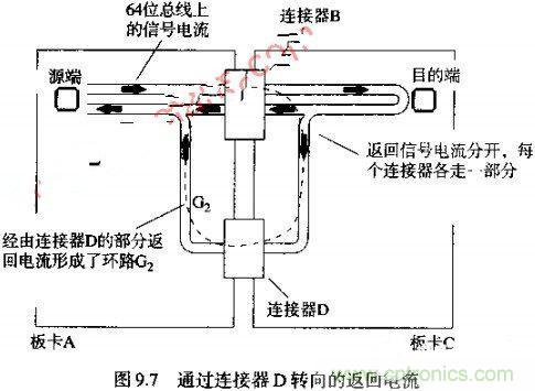 例如,在圖9.7中,假設(shè)板卡A和C共用兩個連接器,另外增加的連接器記為D,將其安排在與連接器B相隔一段距離的地方?,F(xiàn)在有一部分信號的返回電流可以由連接器D上的地線流加A,如圖9.7中的環(huán)路G2所示。