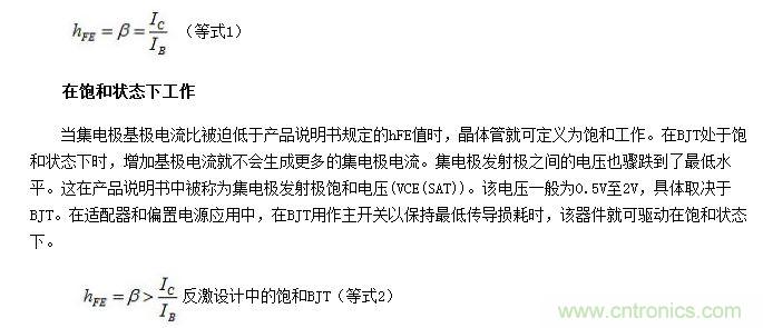 在基極發(fā)射極結(jié)點(diǎn)處于正向偏置,而集電極至發(fā)射極路徑為偏置時(shí),這可打開洪流柵極,允許電流流動(dòng)。連接至集電極的正偏置會(huì)吸引自由電子流向集電極端,在N材料中形成電子匱乏。這可吸引來自基極的電子,將其耗盡在N材料中?,F(xiàn)在電流就可流經(jīng)集電極和發(fā)射極的耗盡層,形成完整電路。集電極電流(IC)的數(shù)量可能會(huì)比基極電流(IB)多好幾個(gè)數(shù)量級(jí)。IC與IB之間的比值一般稱為晶體管的DC電流增益。在產(chǎn)品說明書中也可表達(dá)為Beta(β)或hFE。注意,在晶體管產(chǎn)品說明書中,該比值在特定條件下給出,可能會(huì)有明顯的變化。