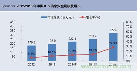 2014藍皮書還指出2013年中國信息安全市場總體規(guī)模為194億元,其中工業(yè)領(lǐng)域信息安全為23.28億元,占中國信息安全市場的12%。中國工業(yè)控制系統(tǒng)(ICS)信息安全市場整體規(guī)模為1.98億元,同比增長10.1%,相比2012年增速提高3.3個百分點。