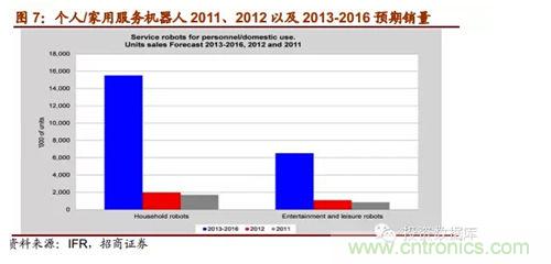 對于個人/家用服務(wù)機器人,IFR預(yù)測2013-2016年估計會有220萬個人/家用機器人得到銷售。其中家用機器人銷量估計為1550萬臺,銷售額達56億美元;娛樂機器人為350萬臺;教育類機器人300萬臺;殘障輔助機器人估計為6400臺。隨著相互學(xué)習(xí)與共享知識云機器人技術(shù)獲得重大突破,小型家庭用輔助機器人大幅度降低生產(chǎn)成本,將在2020年之前形成至少累計416億美元的新興市場;另一方面雖然殘障輔助機器起步還是很慢,但可預(yù)測未來20年會有高速增長。