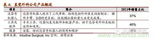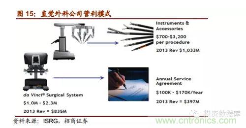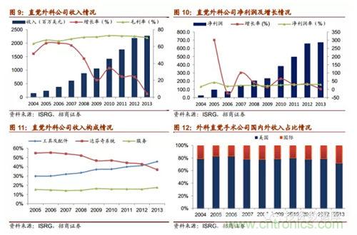 直覺外科公司是全球領(lǐng)先的微創(chuàng)機器人輔助手術(shù)機器人公司,2013年營收達22.65億美元,截止2014年第一季度達芬奇機器人累計銷售數(shù)量為3039臺,2014年8月總市值達159.60億美元。