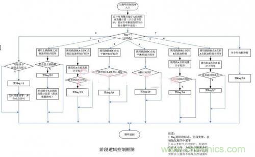 系統(tǒng)框圖如圖3所示,主控循環(huán)程序每隔一個(gè)采樣周期從FPGA接口中讀取各個(gè)傳感器的數(shù)值,并經(jīng)過處理后獲得小車的運(yùn)行狀態(tài),根據(jù)小車的當(dāng)前狀態(tài)采取相應(yīng)的控制算法計(jì)算出電機(jī)所需的控制電壓值,進(jìn)而,該控制電壓值經(jīng)過PMW處理后輸出到小車驅(qū)動(dòng)電機(jī),使小車按照希望的規(guī)律運(yùn)動(dòng)。為了使程序流程清晰簡(jiǎn)潔,框圖中以一個(gè)標(biāo)志信號(hào)來記錄小車所運(yùn)行的階段,控制器則根據(jù)小車所處的運(yùn)行階段進(jìn)行相應(yīng)的控制。