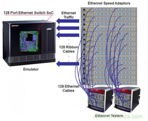 交換機和路由器已達到 256 個端口(到年底將會增加到 1024 個端口),而且它們可處理高達 120 Gb/s 的流量。同時,網(wǎng)絡(luò)交換的延遲也在持續(xù)下降中,最低延遲已降至 1 µs。所有這些因素促使如今的網(wǎng)絡(luò)交換機和路由器芯片成為有史以來最大規(guī)模的芯片,達到了五億門級。在流片完成之前驗證此類復(fù)雜 IC 設(shè)計是一項難以完成的任務(wù)。我們來考慮下具有 128 端口以太網(wǎng)接口的 SoC 設(shè)計。