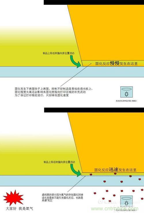 在此前,解決這一問(wèn)題的方法主要是降低固化速度,在樹(shù)脂完全固化之前移動(dòng)底板,使部分固化的樹(shù)脂與透光板脫離接觸,新的低粘度樹(shù)脂會(huì)補(bǔ)充到原來(lái)的位置,然后再開(kāi)始下一層的固化。但這樣一來(lái),打印速度就無(wú)法有效提高了。