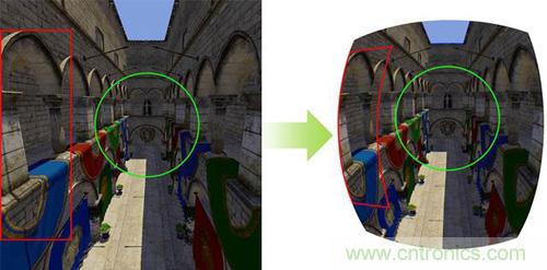 此外,作為VR領(lǐng)域不可或缺的技術(shù)之一,眼球追蹤技術(shù)還可以解決VR圖形畸變的問題。圖形畸變,同樣也是造成使用者眩暈的因素之一。通過上圖,我們可以看到,左邊就是普通的游戲畫面,而右邊,就是VR設(shè)備里所呈現(xiàn)的畫面。由于圖像畸變的原因,VR設(shè)備所呈現(xiàn)的畫面中,圖像的邊緣已經(jīng)發(fā)生了明顯的畸變。即使Oculus曾在此問題上投入了大量的研發(fā)成本并應(yīng)用反畸變算法優(yōu)化了VR設(shè)備的成像,離開了眼球追蹤技術(shù),圖像邊緣的畸變依然無法完美地解決。