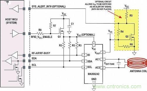 圖4中,I?C接口(SDL和SDA)和PIO信號(hào)(RF-AIP和RF-BUSY功能的多路復(fù)用線)是連接主機(jī)微控制器所必須的,RFID_VCC_ANABLE和SYS_ALERT_INT#信號(hào)可選。MOSFET Q1用于隔離。由于可通過(guò)RF和I?C接口訪問(wèn)標(biāo)簽內(nèi)部的EEPROM,當(dāng)主機(jī)微控制器必須在存在HF場(chǎng)的情況下進(jìn)行連接時(shí),Q1為標(biāo)簽供電。然而,可選的Q2利用電路板上的穩(wěn)壓VCC切換開(kāi)漏SYS_ALERT_INT# (這種情況下不安裝R4)。