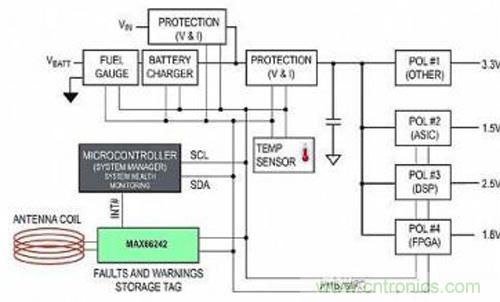 設(shè)計(jì)者可利用MAX66242儲(chǔ)存對(duì)系統(tǒng)運(yùn)行至關(guān)重要的診斷和故障數(shù)據(jù)。在系統(tǒng)“死機(jī)”后或未上電時(shí),可上傳該數(shù)據(jù)。這種系統(tǒng)健康和故障數(shù)據(jù)的收集是通過(guò)NFC/RFID標(biāo)簽的接口實(shí)現(xiàn)的。圖7所示為典型的電源管理系統(tǒng),其中每個(gè)負(fù)載點(diǎn)(POL)穩(wěn)壓器由公共電源管理總線(PMBus)進(jìn)行配置和監(jiān)測(cè)。PMBus僅僅是I?C總線的一種變體。系統(tǒng)正常工作期間,持續(xù)監(jiān)測(cè)每個(gè)POL的關(guān)鍵工作參數(shù)。在持續(xù)監(jiān)測(cè)模式下,系統(tǒng)管理器也可執(zhí)行修正措施,以響應(yīng)故障或工作報(bào)警。