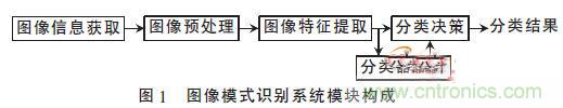 圖像識別技術(shù)是利用計(jì)算機(jī)視覺采集物理對象,以圖像數(shù)據(jù)為基礎(chǔ),讓機(jī)器模仿人類視覺,自動(dòng)完成某些信息的處理功能,達(dá)到人類所具有的對視覺采集圖像進(jìn)行識別的能力,以代替人去完成圖像分類及識別的任務(wù)。圖像模式識別系統(tǒng)通常由五個(gè)模塊組成,如圖1所示。