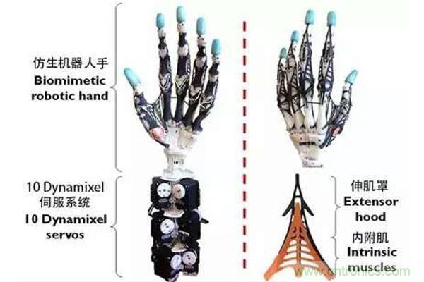 關(guān)節(jié)韌帶(身體用來(lái)固定關(guān)節(jié)且控制它們活動(dòng)范圍的部分)的材料使用了高強(qiáng)度的Spectra帶,并帶有激光切割的橡膠板來(lái)代替增加關(guān)節(jié)依從性的軟組織。伸肌和屈肌的肌腱(用來(lái)矯直和彎曲手指的部分)也由Spectra帶構(gòu)成,同時(shí)用更多的激光切割橡膠板代替了腱鞘和伸肌腱帽,后者是通過(guò)包裹手指來(lái)使其應(yīng)對(duì)靈活性和扭矩的復(fù)雜的蹼狀多層結(jié)構(gòu)。UW(華盛頓大學(xué)縮寫(xiě))手的最后一部分構(gòu)成是肌肉,它是由一排10個(gè)Dynamixel伺服系統(tǒng)組成,它們的電纜布線(xiàn)也緊密的模仿了人手的腕隧道。