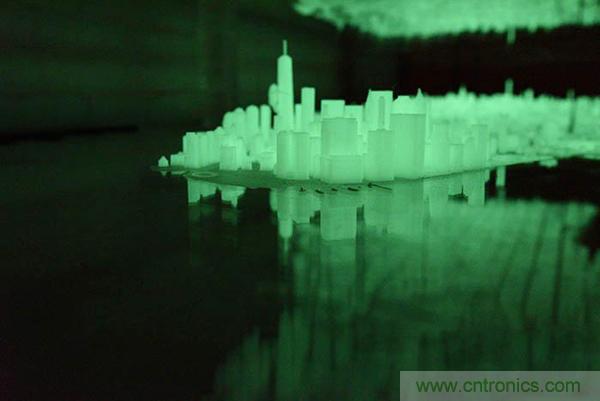 這些城市街區(qū)是用3ds Max和Rhino軟件設計之后,再用能夠在黑暗中發(fā)光的半透明線材3D打印的。這其中的每個模型都經過了精心設計使之盡可能地與真實保持一致。除此之外,Huang還會偶爾在個別細部的地方秀一下自己的幽默感,比如他就3D打印了一個金剛并將其放到了自由塔上。