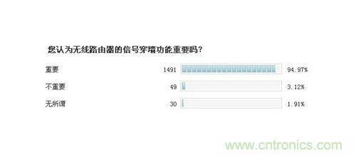 隨著Wi-Fi終端的大量普及,人們對于無線路由器的需求也越來越高,不過在此前展開的有獎?wù){(diào)查活動中,從收集到的大約1500份反饋里,有高達94.97%的參與者認為無線路由器的信號穿墻功能相當重要??梢娙藗冊谶x擇無線路由器產(chǎn)品時,信號能否穿墻,覆蓋范圍怎么樣,已經(jīng)成為他們采購時的首要考察因素。