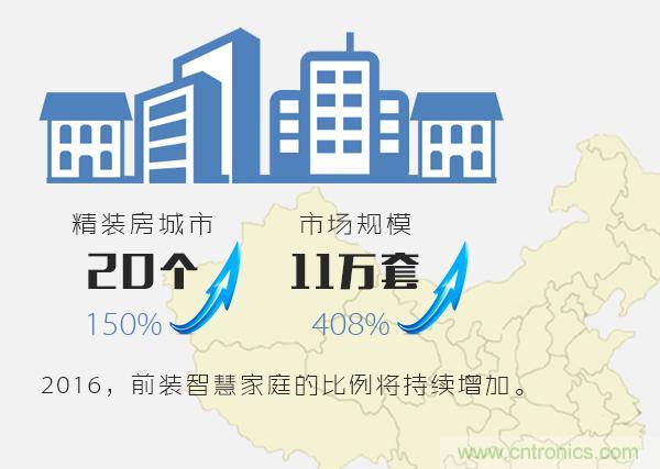 2015年各大地產(chǎn)商和物業(yè)公司都在推出智慧家庭和智慧社區(qū)的產(chǎn)品或樣板,包括花樣年、招商地產(chǎn)、金地物業(yè)、保利地產(chǎn)、萬科等。據(jù)奧維數(shù)據(jù)顯示,2015年有智能精裝房的城市達到20個,同比增長150%;市場規(guī)模達到11萬套,同比增長408%。2016年面對低迷的樓市,為了維持房價,商品房中前裝智慧家庭的比例還會增加。