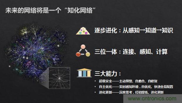 “它”將是一個“知化”網(wǎng)絡(luò),它將逐步進(jìn)化,從現(xiàn)在這種冰冷的物理連接到主動感知各類連接設(shè)備,再到分析了解網(wǎng)絡(luò)運行的各種數(shù)據(jù),知曉如何適應(yīng)外界的變化,最后網(wǎng)絡(luò)將有智能思考的能力,形成自身的知識,會進(jìn)行策略選擇和推演,實現(xiàn)人、網(wǎng)絡(luò)和應(yīng)用的融合一體。 未來這個“知化”的網(wǎng)絡(luò)將是集連接、感知、計算和數(shù)據(jù)服務(wù)為一體的網(wǎng)絡(luò),將會實現(xiàn)超級安全、自主優(yōu)化、進(jìn)化更新等三大能力。
