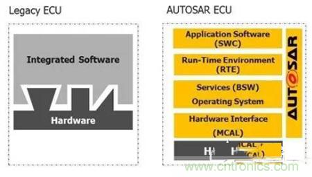 就本質而言,AUTOSAR提供標準的ECU接口定義,使設計人員能夠具體指定每個汽車ECU中都需要的可重復使用之標準化軟件層和組件。該標準不受硬件的影響,這意味著應用軟件和硬件平臺是相互獨立的。應用軟件開發(fā)人員可在應用軟件中明確地說明各個汽車功能的細節(jié),而不用擔心相關軟件服務和硬件接口。過去,軟件和硬件緊密地整合在一起,因此很難實現(xiàn)可移植性和可重復使用(圖1)。