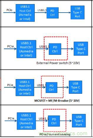 圖2:四種USB Type-C過流保護(hù)方案設(shè)計(jì)架構(gòu)