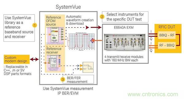 圖1:圖中顯示初期的802.11ax裝置評(píng)估流程圖。流程的核心是Keysight systemVue ESL軟體,它具有強(qiáng)大的功能及靈活性,可解決與802.11ax裝置設(shè)計(jì)和測試相關(guān)的挑戰(zhàn)。藉由SystemVue,在標(biāo)準(zhǔn)草案階段所開發(fā)出的IP,可快速連接到各種儀器進(jìn)行設(shè)計(jì)驗(yàn)證測試。