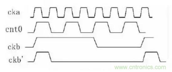 為了方便討論,時(shí)鐘樹插入以后,假設(shè)A與B之間有1個(gè)ckaCycle的skew;從圖3可以看到如果采用A點(diǎn)作加法器的輸入時(shí)產(chǎn)生的波形是ckb’,采用B點(diǎn)作為輸入時(shí)的波形是ckb,顯然,從例1的代碼來看,ckb才是正確的。因此必須注意到,如果時(shí)鐘當(dāng)作普通的信號(hào)使用時(shí)可能帶來的問題,這類問題并沒有一個(gè)通用的解決辦法。在這個(gè)例子中,不采用時(shí)鐘樹上的信號(hào)才是正確的,但是在另外一些應(yīng)用中,就必須采用時(shí)鐘樹上的信號(hào)。比如,時(shí)鐘是CK的兩個(gè)觸發(fā)器中鎖存的數(shù)據(jù)再由CK的高電平和低電平選擇輸出,那么,這個(gè)時(shí)候就需要作為選擇信號(hào)的CK從時(shí)鐘樹上拉過來。因此,如果設(shè)計(jì)中用到了時(shí)鐘信號(hào)作為普通信號(hào)的情況,在后端設(shè)計(jì)時(shí)就必須特殊處理。