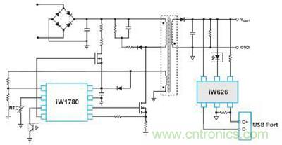 典型的手機(jī)充電器的硬件結(jié)構(gòu)(以基于Dialog方案的高通QC2.0快充協(xié)議為例)如圖 1所示。iW626作為QC2.0協(xié)議控制器,經(jīng)由USB口的D+/D-信號(hào)和手機(jī)側(cè)AP進(jìn)行供電協(xié)商,然后通過光耦控制原邊的AC/DC控制器iW1780完成輸出電壓的調(diào)整。