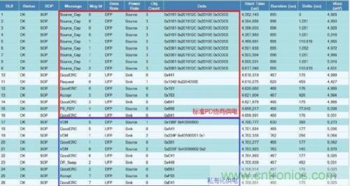 為了更加有效開發(fā)和準(zhǔn)確驗(yàn)證基于控制流程的協(xié)議溝通,本文采用賽普拉斯研發(fā)的PD協(xié)議分析儀CY4500 EZ-PD™ Protocol Analyzer。CY4500 協(xié)議分析儀通過抓取配置通道(CC,Configuration Channel)上的數(shù)據(jù)包,并通過USB接口發(fā)送到主機(jī)端,通過軟件EZ-PD Analyzer Utility解碼并顯示PD協(xié)議包。CY4500不僅可以實(shí)時(shí)顯示并解析PD通信包,而且還實(shí)時(shí)測量電力傳輸過程中的電壓和電流值,進(jìn)而縮短了開發(fā)周期,對(duì)于調(diào)試以及兼容性測試幫助非常大。