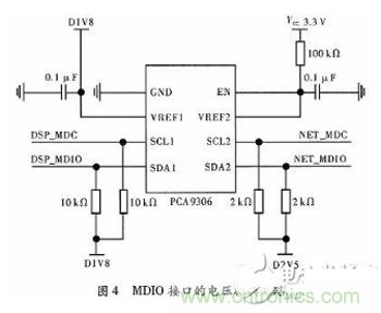 因?yàn)?8E1111上集成的MDIO與C6678集成MDIO模塊進(jìn)行連接時(shí),電壓有所差別,前者電壓為2.5 V,后者電壓為1.8 V,所以在二者之間應(yīng)該添加電壓轉(zhuǎn)換器。本文采用一片PCA9306,實(shí)現(xiàn)2.5 V和1.8 V之間的電平轉(zhuǎn)換,其連接電路如圖4所示。