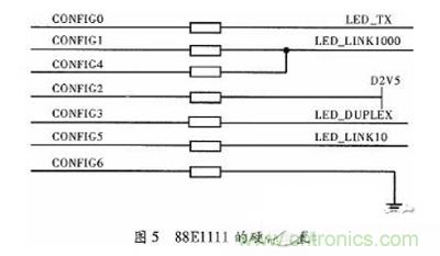 88E1111與C6678的MDIO模塊相連接,MDIO最多可識(shí)別32個(gè)物理芯片,在使用物理芯片之前需要對(duì)其進(jìn)行配置,配置內(nèi)容主要包括芯片的地址、模式等。配置CONFTG[6:0]管腳定義可查詢(xún)文獻(xiàn),本文配置的硬件電路如圖5所示,圖5中可以不使用電阻,本文為了測(cè)試方便,加一個(gè)0 Ω的電阻。