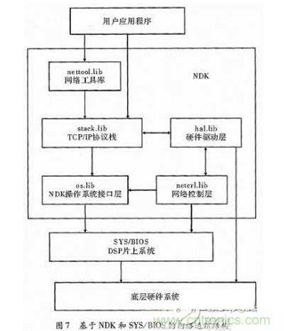TI針對(duì)網(wǎng)絡(luò)開(kāi)發(fā)發(fā)布了網(wǎng)絡(luò)開(kāi)發(fā)套件(Network Development Kit,NDK),能將多個(gè)模塊的配置操作交給NDK網(wǎng)絡(luò)框架實(shí)現(xiàn),同時(shí)數(shù)據(jù)分包和解析也無(wú)需程序員過(guò)多考慮,加速了網(wǎng)絡(luò)開(kāi)發(fā)進(jìn)程。NDK構(gòu)建在實(shí)時(shí)操作系統(tǒng)SYS/BIOS之上,NDK通過(guò)OS抽象層與BIOS進(jìn)行交互,同時(shí)BIOS的cfg配置文件能對(duì)NDK各模塊進(jìn)行可視化查看。