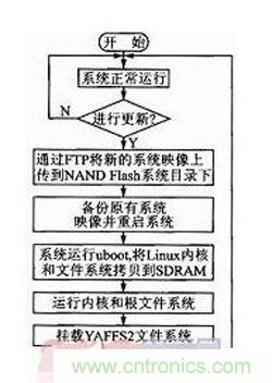 本設(shè)計對uboot和Linux內(nèi)核進(jìn)行改造,使其支持YAFFS2文件系統(tǒng),對系統(tǒng)添加ftp、telnet等應(yīng)用服務(wù)。系統(tǒng)更新流程如圖2所示。系統(tǒng)正常運行時管理人員可以通過telnet遠(yuǎn)程登錄到嵌入式終端進(jìn)行監(jiān)控和管理。當(dāng)需要對系統(tǒng)進(jìn)行更新時,通過遠(yuǎn)程管理系統(tǒng)的ftp客戶端登錄到嵌入式終端,將需要更新的內(nèi)核映像和文件系統(tǒng)上傳到NAND Flash。上傳完畢后對原有的內(nèi)核映像和文件系統(tǒng)進(jìn)行備份并重啟系統(tǒng)。系統(tǒng)重啟后uboot將NAND Flash中更新后的內(nèi)核映像和文件系統(tǒng)搬運到SDRAM中,然后跳轉(zhuǎn)到SDRAM中啟動Linux系統(tǒng),掛載YAFFS2文件系統(tǒng),啟動各種應(yīng)用服務(wù)。