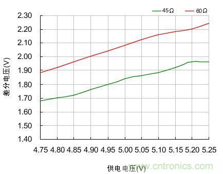 差分電壓除負(fù)載電阻的影響外,還會受到供電電壓的影響,如圖 2我們測試了CTM1051M模塊在不同電壓,不同負(fù)載下的差分電壓幅值,可以看到電源電壓升高0.5V,差分電壓幅值會升高約0.3V。