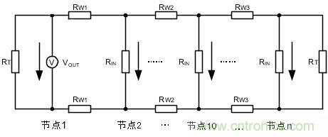 圖 3為CTM1051M推薦的組網(wǎng)拓?fù)?,我們要考慮總線電阻,終端電阻,發(fā)送點,接收點電壓參數(shù)。畫出其等效電路如圖 4所示。